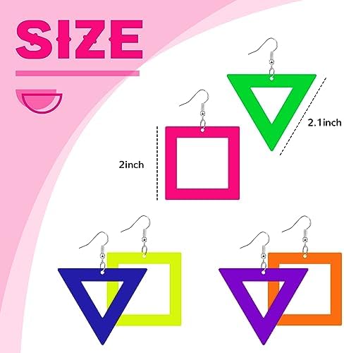 Introducing our 3 Pairs 80s Neon Earrings, the perfect retro pendant acrylic drop dangle earrings for women to complete your 80’s outfit. These earrings are designed to bring back the vibrant and colorful style of the 80’s, adding a fun and lively touch to any party or special occasion. Made from high-quality acrylic material, these earrings are lightweight and comfortable to wear throughout the night.