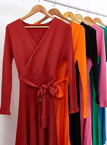 ZESICA Women’s 2023 Fall Long Sleeve Wrap V Neck Ribbed Knit Pleated A Line Pullover Sweater Dress with Belt